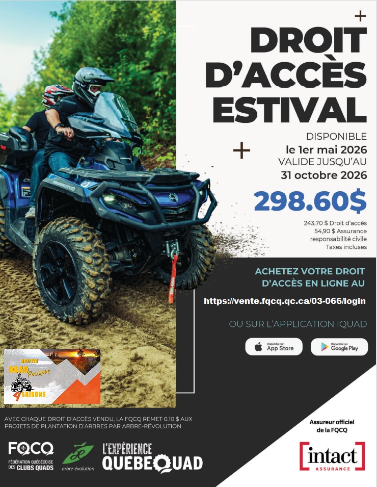 De plus, Adeptes Quad Portneuf entretient 200 km de sentiers 4 saisons et d’hiver. Le réseau de sentier quad fédéré permet aux quadistes de rejoindre les sentiers fédérés des clubs de la Mauricie. Vous pouvez faire une boucle pour aller à La Tuque via la ZEC Batiscan-Neilson et la ZEC Tawachiche. Du côté Est de Portneuf, le réseau de sentier quad fédéré rejoint les autres clubs de la région de la Capitale-Nationale.